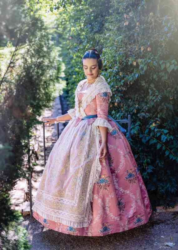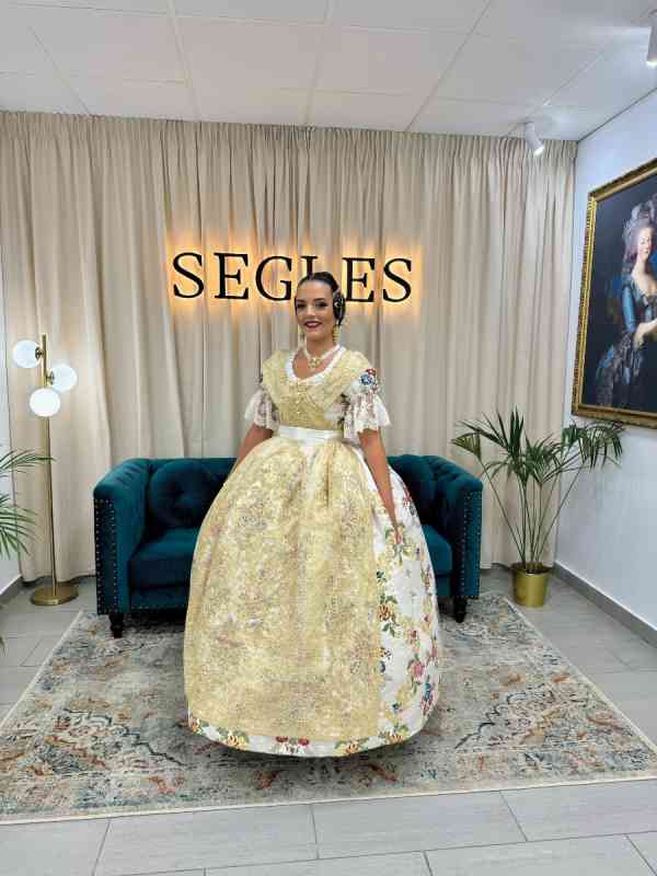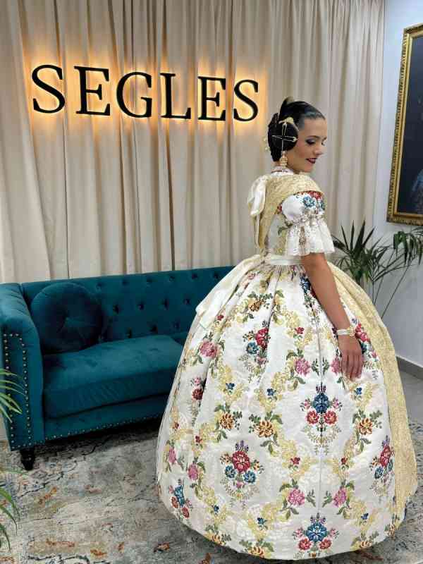 Traje confeccionado con la seda estrecha Arribas de Vives y Marí, en color pruna. La riqueza del tejido se ve realzada por dos metales diferentes, oro viejo y oro. Manteletas en seda oscura y oro combinado con oro viejo.
