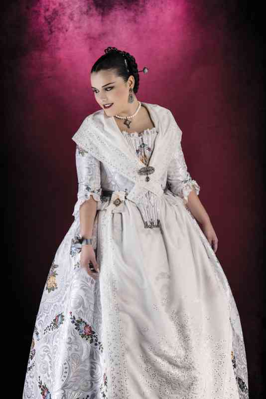 Marina Romeu Hoces, fallera mayor 2018 de la falla Pío XI-Fontanares luce un traje del S. XVIII en color ivory sin metal, patronaje del justillo de época, así como las mangas, terminadas en ‘hacha’. Pañuelo y delantal de batista bordados de manera artesanal.