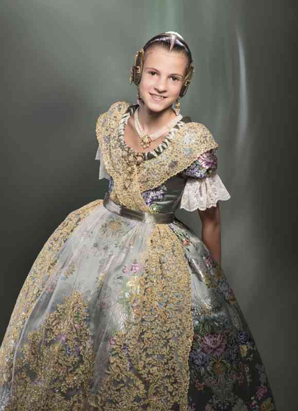 Marina Escudero Vanaclocha, fallera mayor infantil 2018 de la falla Fray J. Rodríguez-Pintor Cortina, luce un traje en seda de color Verde Turia, manteletas bordadas en hilo oro y lentejuelas oro.