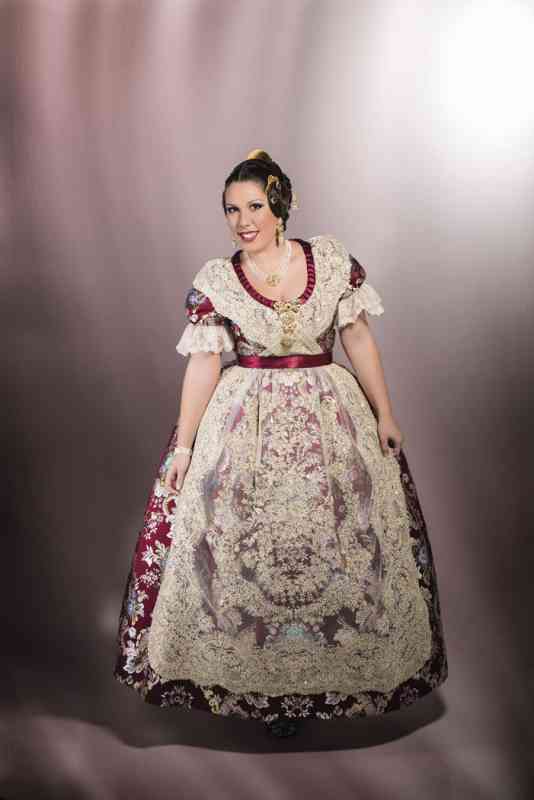 Vanessa Espín i García, fallera mayor 2018 de la falla Nicolau Andreu de Torrent lleva un traje en seda de color Rojo Toscana, manteletas bordadas en hilo oro y lentejuelas oro.