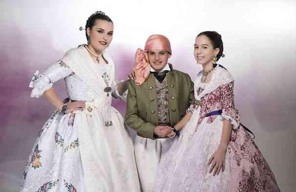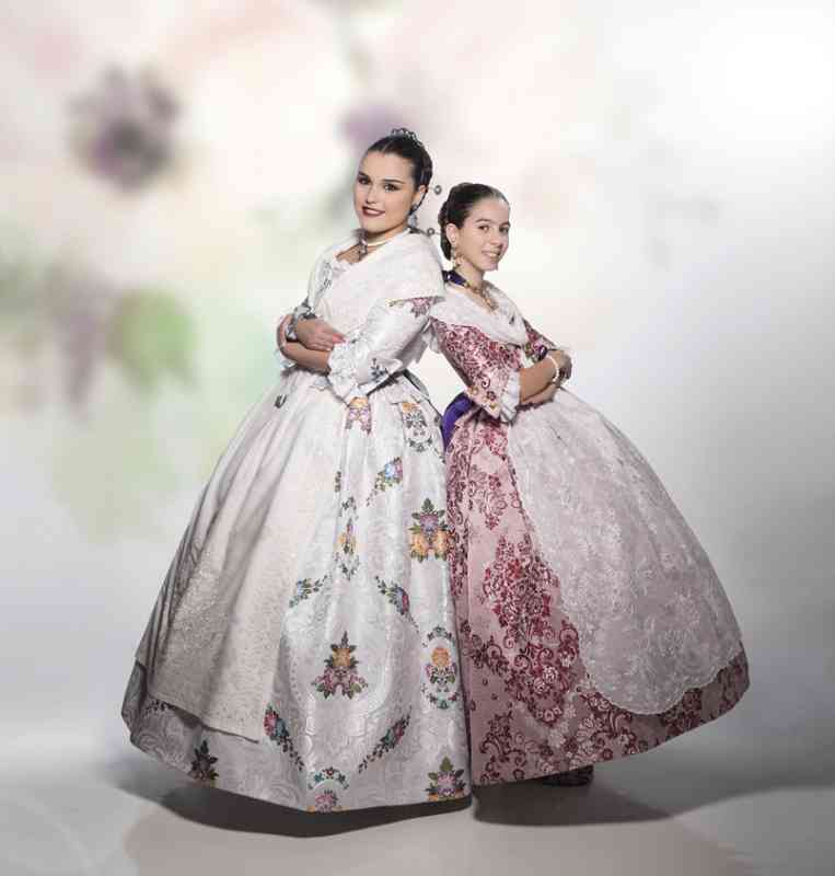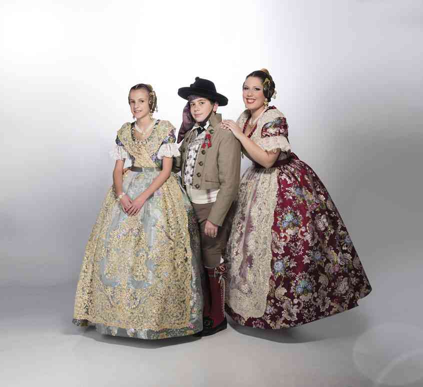 Miriam Cervilla Rives, fallera mayor infantil 2018 de la falla Venezuela viste un traje del S. XVIII con tejido exclusivo de fondo listado real. El patronaje del justillo es de época, así como las mangas, terminadas en ‘hacha’. Pañuelo y delantal de batista bordados de manera artesanal.