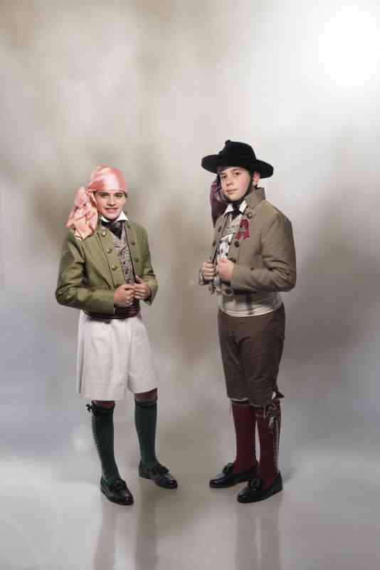 Iván Gil Tárraga, presidente infantil 2018 de la falla Costa y Borrás-Agustina de Aragón-Santander, con traje de torrentí combinando tejidos en tonos marrones y chaleco en seda, corbatín y aguja al cuello, abotonadura personalizada, así como calzas, faja y pañuelo.