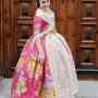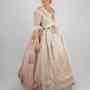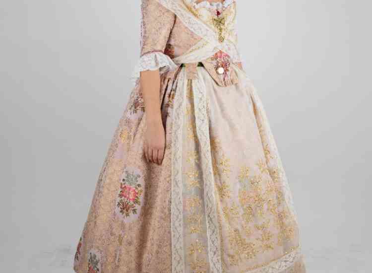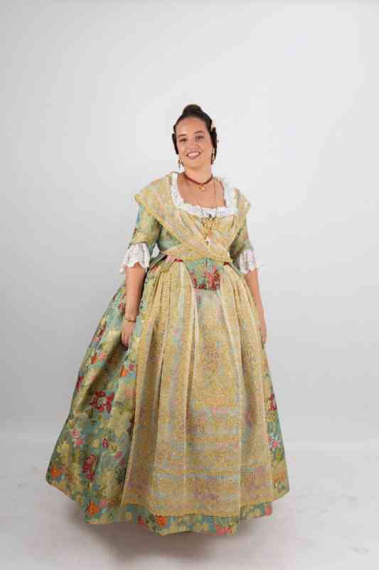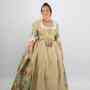 Brocatel semimanual de Compañía Valenciana de la Seda en color fusión. Traje confeccionado al estilo del siglo XVIII con pañuelo y delantal de María Teresa Albuixec con vainicas bordado en cadeneta de oro.