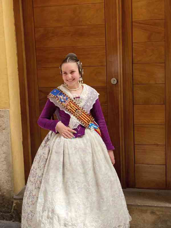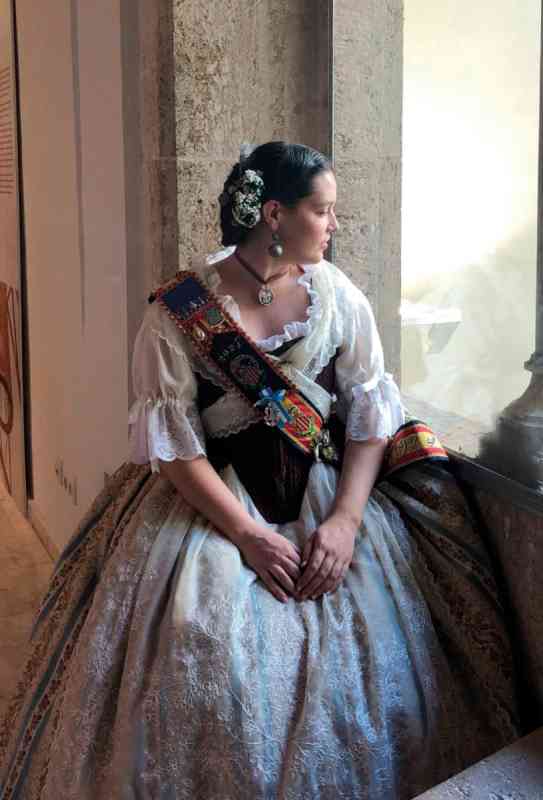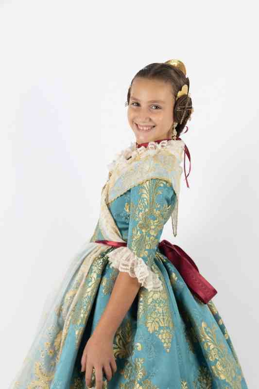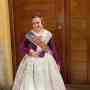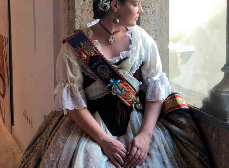 Sara Doménech viste una tela de Garin, colección Jardines de Valencia, en color azul gris. Traje confeccionado al estilo del siglo XIII, con pañuelo y delantal en tul de algodón bordado en cadeneta de oro.