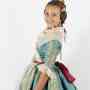 Sara Machi viste un brocatel de seda Elegat en color Tifanny de Vives y Marí. Traje confeccionado al estilo del siglo XVIII con pañuelo y delantal de nipi bordados en oro y lentejuelas.