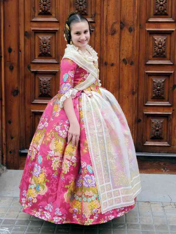 Sara viste un traje confeccionado con una tela de Garín, que presenta dibujo de óvalos con flores en el centro de los mismos y guirnaldas de color amarillo antiguo. El pañuelo y delantal, con nipi, encajes antiguos enmarcando el bordado de oro y lentejuelas, de la colección de Eugenia Puertes.